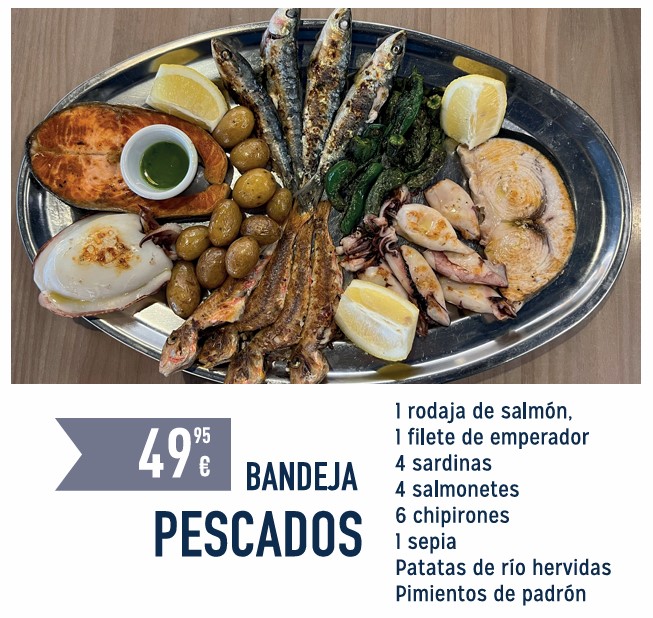 Children’s menu (Up to 12 years old)……To choose from: Chicken nuggets, hake sticks, squid rings. (includes drink, chips and dessert)..8.95€